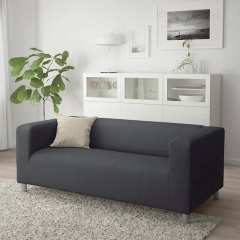 Soffa med lös sittdyna. Framben med hjultrissor.
