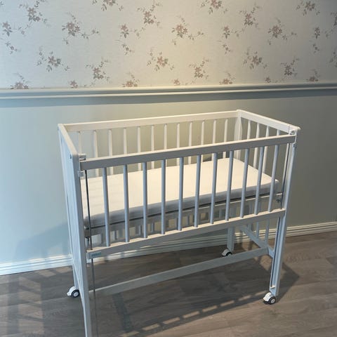 Madrass ingår. Kan även skicka med spjälskydd, sängkläder och täcke om så önskas.