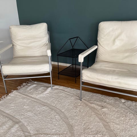 Bra begagnat skick. De kromade/silvriga fötterna har mindre repor (inget som sticker ut). Några fästen i klädseln har lossnat och behöver sys fast — ett mycket litet jobb som inte syns, därför har jag inte åtgärdat det själv.