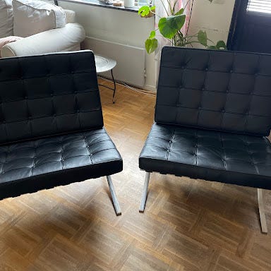 Säljer två eleganta Barcelona-stolar (replika) samt matchande fotpall som även kan användas som avlastningsbord. Tidlös design som passar perfekt i vardagsrum, kontor eller lounge.
