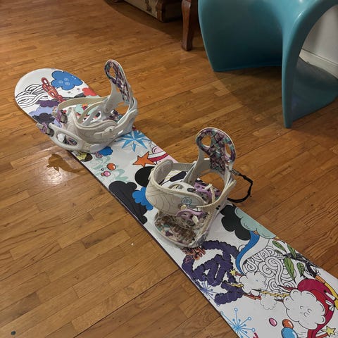 120 cm Burton Snowboard med bindningar. Ursprungligen grön men målad svart, därför lite slitet och skavt utseende ovanpå.