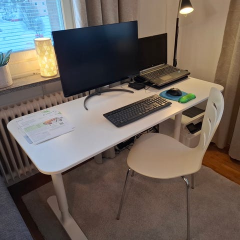 Kvalitet skrivbord med elmotorstyrning, finns några skavmärken pågrund av flytt annars fint. Djup 70 cm och bredd 115 cm.