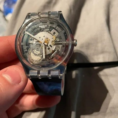Klassisk 90-tals Swatch med transparent boett och svart tavla.