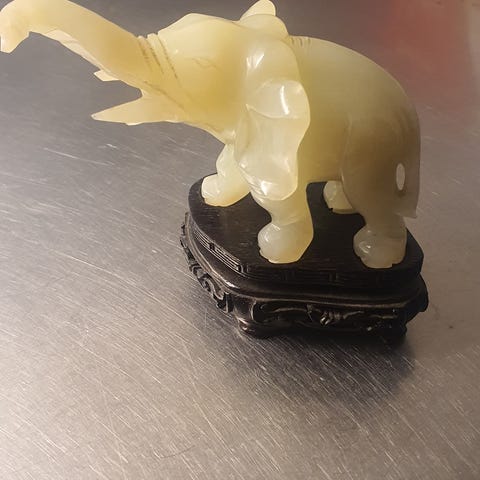 Staty föreställande en lyckobuddha i grön, halvt genomskinlig stenliknande prydnadsmassa. Figuren står på en mörkbrun träfot med dekorativt utskurna detaljer och guldfärgad text framtill. Buddhan håller bland annat en säck och ett blomliknande föremål och bär halsband. Passar som inredningsdetalj eller prydnad i hem eller kontor.
