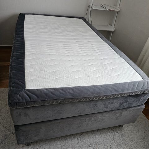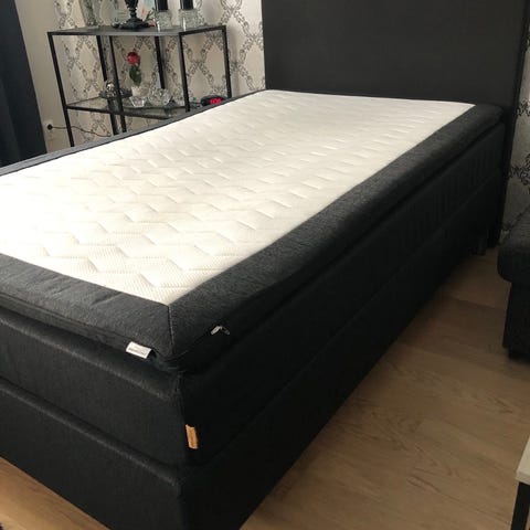 Kontinentalsäng och sänggavel från Mio. Fint skick trots några år på nacken då den är sparsamt använd som gästsäng. Fläckar finns på bäddmadrassen, nästintill nytt madrasskydd ingår.