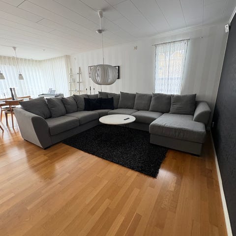 Stor grå schäslongsoffa till salu. Super skön och rymlig.