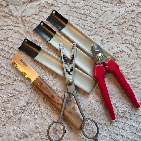Saxar för klippning och trimning av hund. Använt till Lagotto. Fr v Groom 14cm med rund topp nypris 849kr, Roseline 21,5 cm nypris 1320 kr, Panther 20 cm nypris 490 kr. Groom och Roseline fantastiska att arbeta med. Mindre nöjd med Panther. Säljs tillsammans.