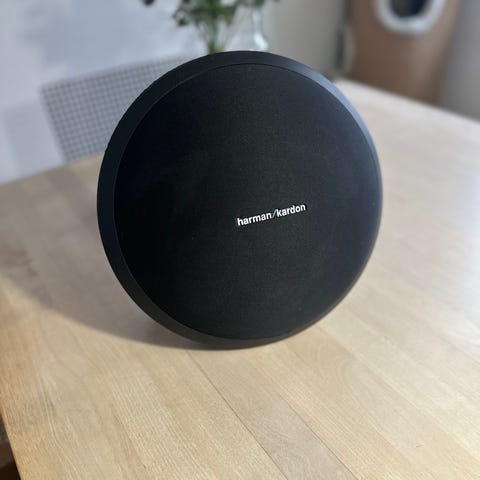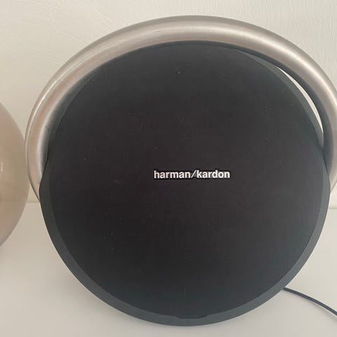 Harman Kardon bluetooth-högtalare i svart färg. Rund fristående modell med inbyggda stödben och bärhandtag på baksidan. Högtalaren har volymkontroller på ovansidan och anslutningar på baksidan. Nätadapter och strömkabel ingår enligt bild. Passar för trådlös uppspelning av ljud från kompatibla enheter via bluetooth i hemmet eller på kontoret.
