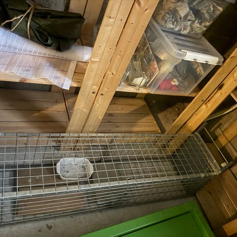 Smådjursbur i trä med hjul. Konstruktionen är i trä med front i genomskinligt material för insyn. Ovanpå finns ett lock med ventilationsöppningar. Passar för mindre sällskapsdjur som exempelvis gnagare, där djuret får både skyddad plats och möjlighet till aktivitet i hjulet.
