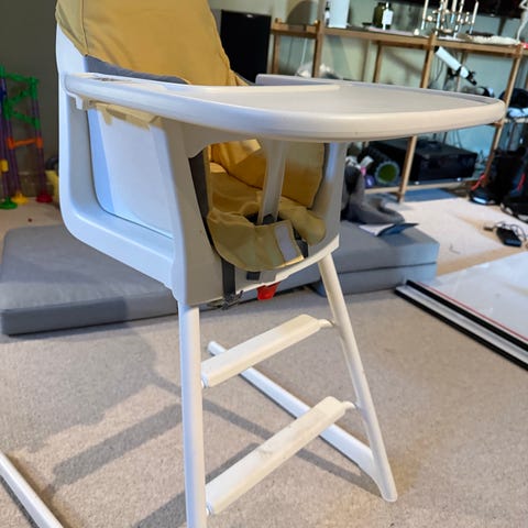 Barnstol i hög modell med vit stomme och löstagbart brickbord i plast. Brickan har upphöjd kant och inbyggd hållare för mugg eller flaska. Sitsen har grå vadderad dyna och säkerhetsbälte. Passar för små barn som kan sitta själva vid matbord eller lekbord.