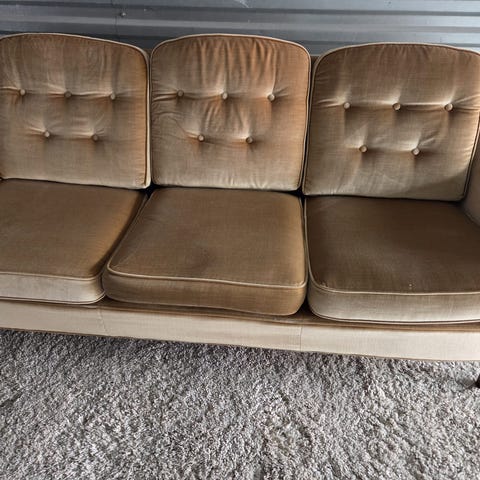 Beautiful 3-seater green velvet sofa with elegant button detailing and solid wooden legs.