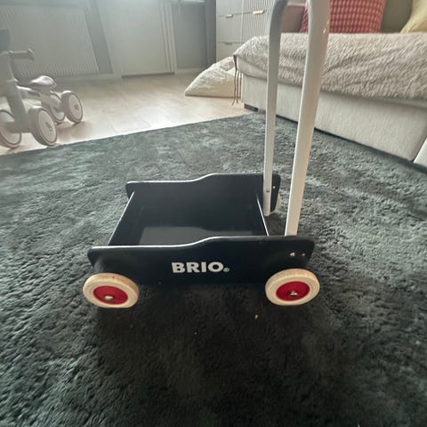 Säljer en stabil och populär gåvagn från BRIO i klassisk röd modell med vit handtag och gula detaljer. Perfekt när barnet ska ta sina första steg – stadig konstruktion som ger bra stöd och balans.
