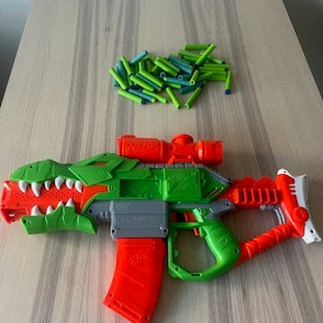 Oanvänd Nerf Dinosquad Tricera-Blast, lämplig för barn 8+. Kan laddas med tre pilar. 12 pilar medföljer. Rolig att ladda, tuff design särskilt för de som gillar dinosaurier.