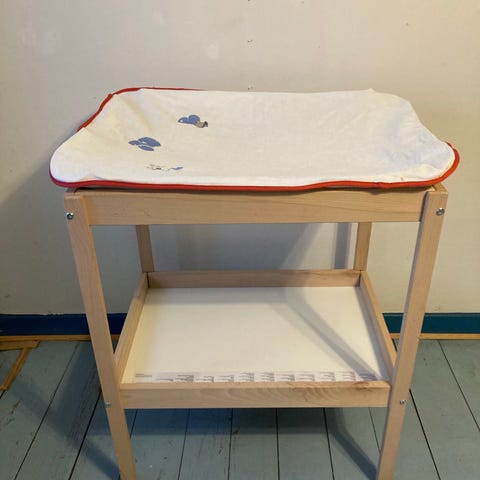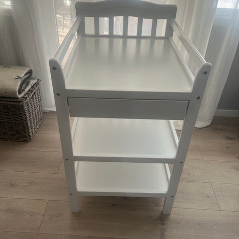 IKEA skötbord i vitt med två öppna hyllplan under skötytan. Bara monterad aldrig använt inga skador.Skötbordet har räcken runt skötytan och spjälor på sidorna. Öppen förvaring underlättar åtkomst till blöjor, kläder och andra tillbehör vid skötsel av barn. Mått enligt bild: cirka 82 cm långt, 54 cm djupt och 95 cm högt.