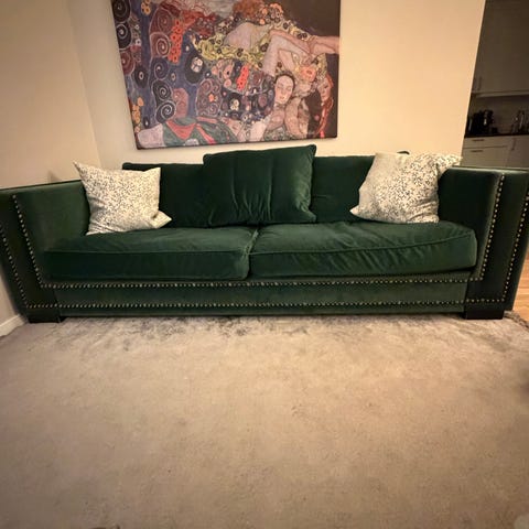 Fin soffa i sammet. Mörkgrön i färgen. Det finns fler bilder på Homelines hemsida. Hämtas på Götgatan 69.