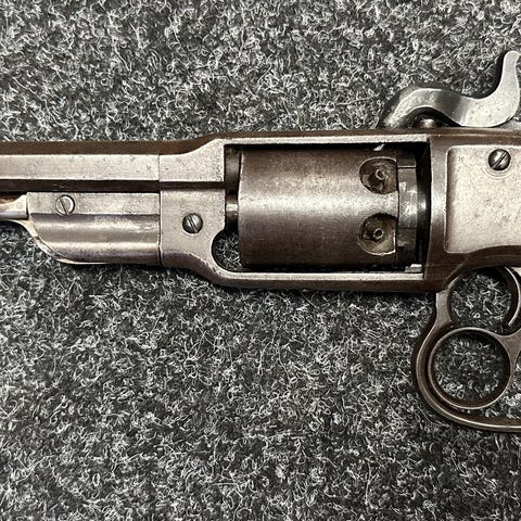Antik flerskotts pistol i metall och trä. Pepperbox