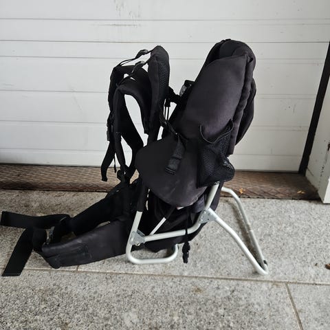 Barnsätet är vadderat med justerbara remmar och fotstöd. Det finns flera förvaringsfack och fickor undertill och på sidorna för packning. Ovanför sitsen finns ett enkelt sol- eller regnskydd. Lämplig för att bära mindre barn vid promenader och utflykter där barnvagn inte är praktisk.