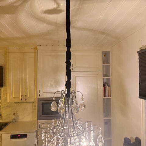 Fin kristallkrona som passar lantligt eller shabby chick stil. Längd från fäste 110 cm.