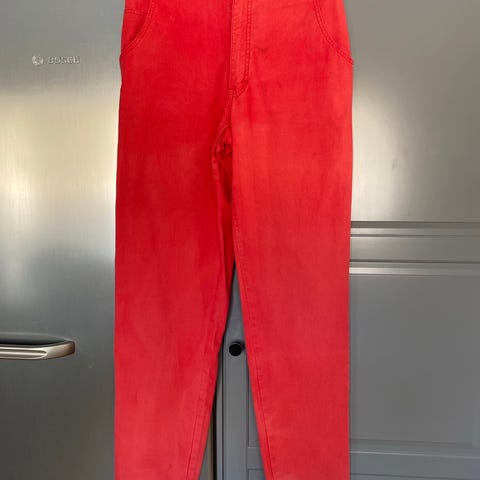 Snygga mörkröda byxor från 90-talet, 85% bomull 15% polyester, tyget är mjukt och svagt luddigt, nästan lite som flanell. Med sidfickor, och veck fram som ger fin vidd, ficklock bak. Från Finska P.T.A., märkta "Illusions Nepal". Legat nedpackade sedan 90-talet.