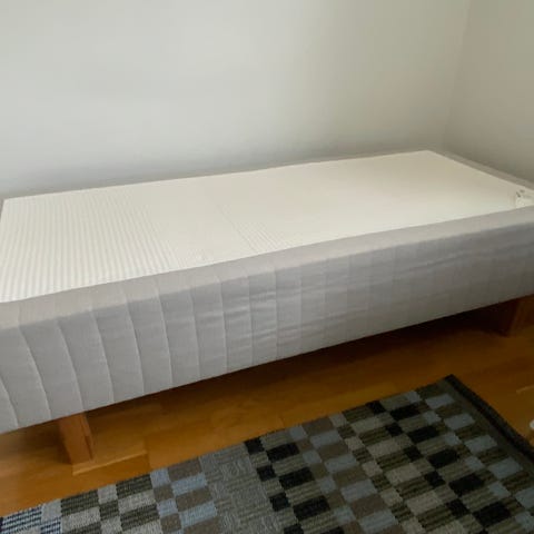 IKEA säng i måtten 90 x 200, med bäddmadrass i enkelstorlek. Sängen har en vit bäddmadrass med räfflad ovansida och en mörk sängkappa runt underdelen. Passar som enkelsäng i sovrum eller gästrum.