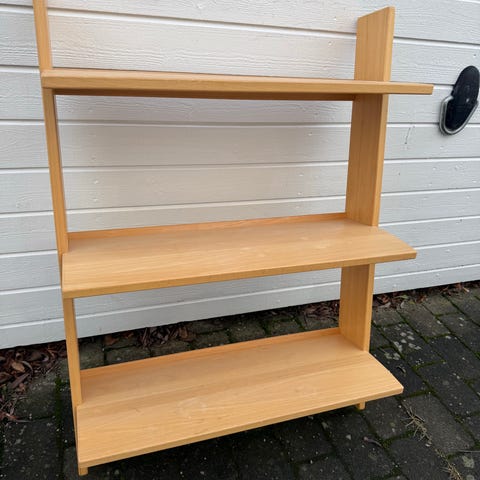 två rektangulära hyllplan med öppet utrymme emellan och tre ben, där ett ben är placerat i bakkant för att bordet ska kunna stå nära vägg. Passar som avlastningsbord, sängbord eller litet soffbord i vardagsrum, hall eller sovrum.