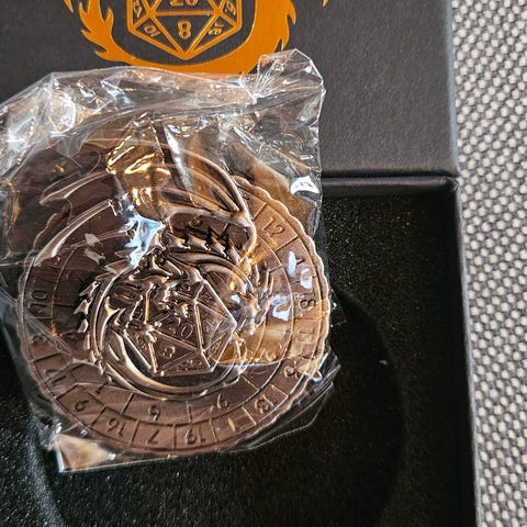 Livräknare för Dungeons & Dragons. Räknaren är i metall och har en snurrfunktion för att välja nummer. Levereras i en svart låda med ett drakmotiv.