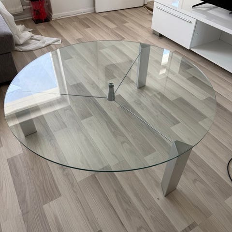 Vackert stilrent soffbord/sidobord i glas och krom. 55 cm i diameter. Nyköpt från Svenska Hem och knappt använt. Inköpspris 3 900 kr. Ett fynd!