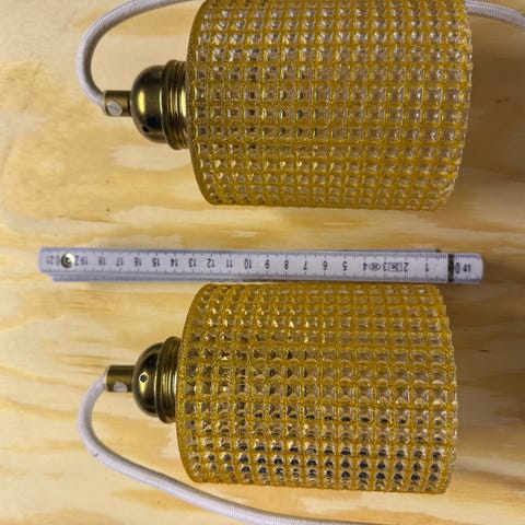 Två taklampor i grönt glas.