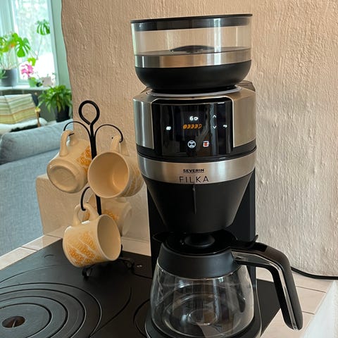 Moccamaster kaffebryggare i svart utförande med glaskanna. Bryggaren har vattenbehållare med nivåmarkering och separat filterhållare. På fronten finns strömbrytare och värmeplatta för kannan.