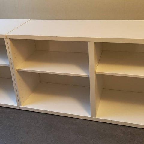 Vit Ikea Kallax hylla eller bänk. Vitfärgad, i helt ok skick. Ren och fin men några skruvhål finns och mindre småmärken på ena kortsidan. Har släppt lite i ena hörnet, allt syns på bilderna.