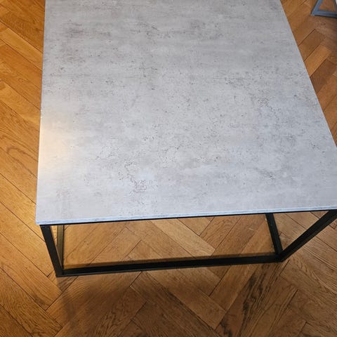 Svart metallram. Skivan är i laminat, sten / betong imitation.
