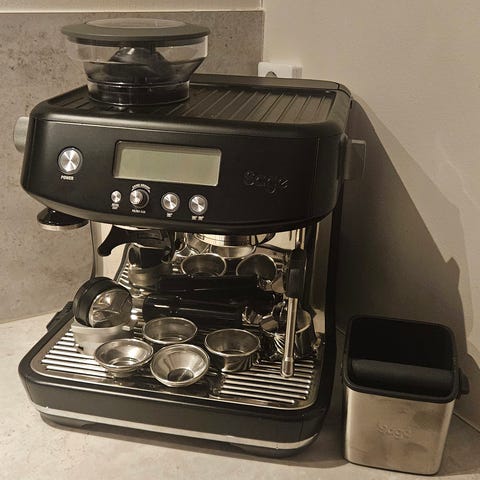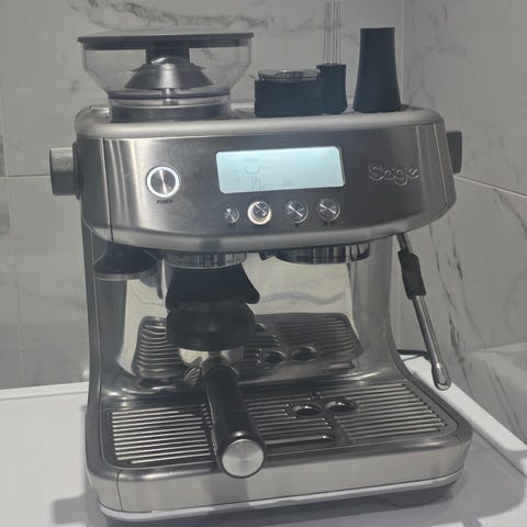 Sage Barista Touch espressomaskin i rostfritt stål. Integrerad kvarn ovanpå maskinen och pekskärm på fronten för val av dryck och inställningar. Utrustad med ångstav för mjölkskumning samt droppbricka och avtagbar vattenbehållare. På bilderna syns portafilter, filterkorgar, tamplåda/verktygsfack och mjölkkannor som tillbehör. Maskinen är avsedd för tillredning av espresso och kaffedrycker med nymalda bönor i hemmamiljö.