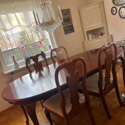 Matbord med två iläggsskivor. Iläggsskivorna har längd 45 cm styck ger total bordslängd 246 cm. Nio stolar i två olika modeller.