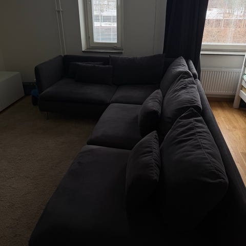 L-formad svart Soffa. Några år gammal. Hel förutom på ett ställe (se bild). Man kan ta av tyget från kuddarna och tvätta dem.