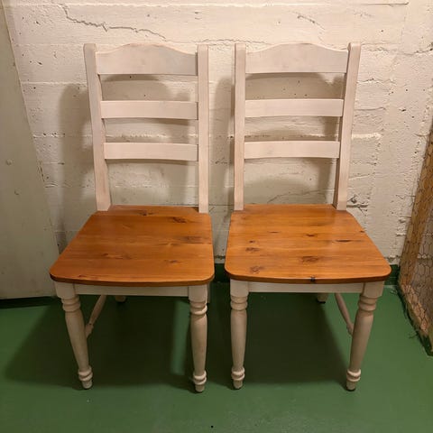 Köksstolar sköna att sitta på, dyna ingår. Vet inte varumärket. De är tillverkade i björk och är lackade i vitt hos möbellackerare. Två av stolarna har lagad sits(se bild) och skumgummi dynorna har missfärgat stolsitsen något.