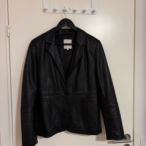 Otroligt snygg figursydd kavaj i mjuk skinnlook från H&M. Sitter väldigt smickrande och markerar midjan fint. Materialet är mjukt och följsamt och känns nästan som nappaskinn.