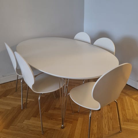 Vitt bord med metallben och 6 sjuanstolar