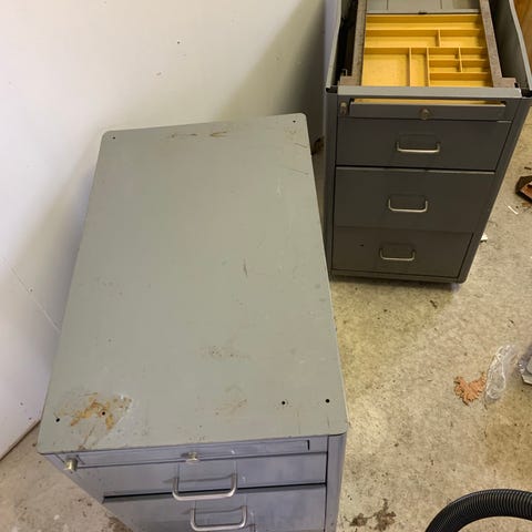 Begagnade stapelbara lådor från Schäfer. Lådorna är tillverkade i grå metall och har handtag på framsidan samt etikettfästen för märkning. Passar för förvaring och sortering i exempelvis verkstad, förråd eller hobbyrum.