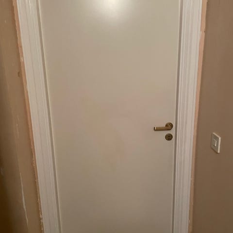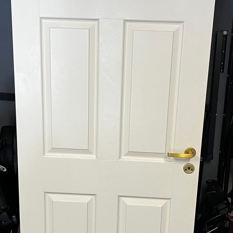 Vit innerdörr med karm, klassisk spegelindelning. Dörren har låskista men saknar handtag. Modulmått 20x7.