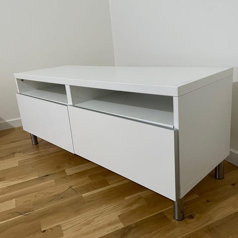 Tv-bänk av okänd Ikea-modell med mycket plats för förvaring. Höjd 74, bredd 120, djup 41cm. Två lådor överst och två skåp underst.