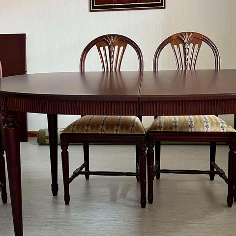 Vackert gustaviansk matsalsmöbel Axet med 4 stolar och 2 iläggsskivor. Mycket stabilt och rejält med gammal stil och detaljer.