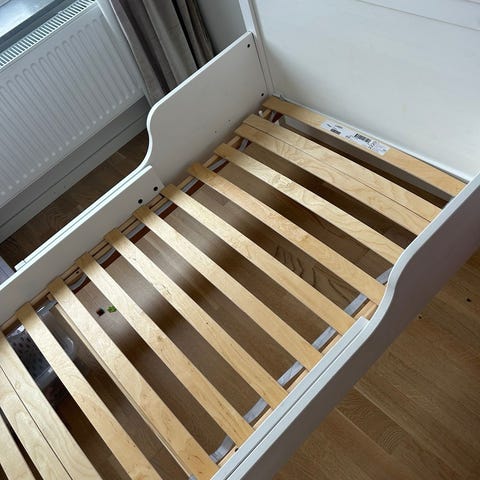 Jollyroom juniorsäng med husformad ram i grått. Sängen har ribbotten i trä och är anpassad för junior-/barnmadrass.Passar som övergångssäng mellan spjälsäng och fullstor barnsäng i barnrum eller lekrum. L140B70H30Barnen lät kan gå ner själv