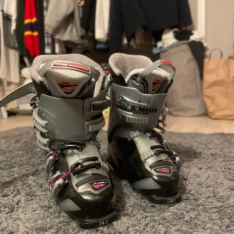 Scarpa pjäxor i blått och vitt, i det närmaste oanvänt skick. Innerstövel med Intuition-foder, med snörning. Yttersula med Vibram-gummi och grovt mönster.
