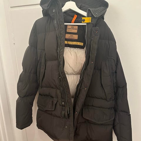 Parajumpers vinterjacka för herr i storlek L. Jackan är grå och har dunfyllning. Modellen har huva, hög krage och flera ytterfickor framtill. Inneretiketten anger "Winter Equipment" och storlek Large. Passar som varm ytterjacka under kalla vinterdagar.