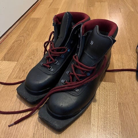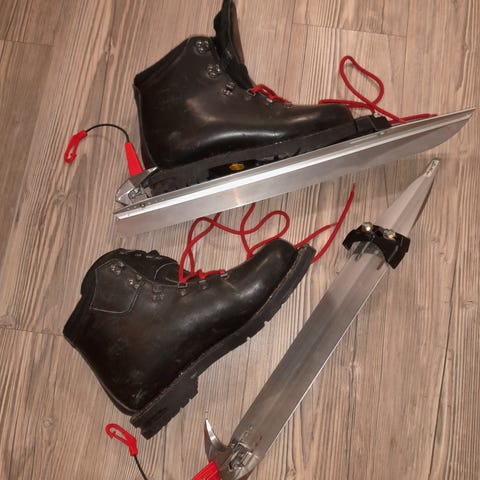 Lundhags skridskor långfärdsskridskor i storlek 38,5/39 (5,5) i mycket fint skick. Endast använda fåtal gånger pga fel storlek. Svarta läderkängor med röda skosnören och grov sula, avsedda att användas tillsammans med medföljande långfärdsskenor eller telemarksskidor. Skenorna har justerbara remmar för att fästa kängorna. Passar för långfärdsskridskoåkning.