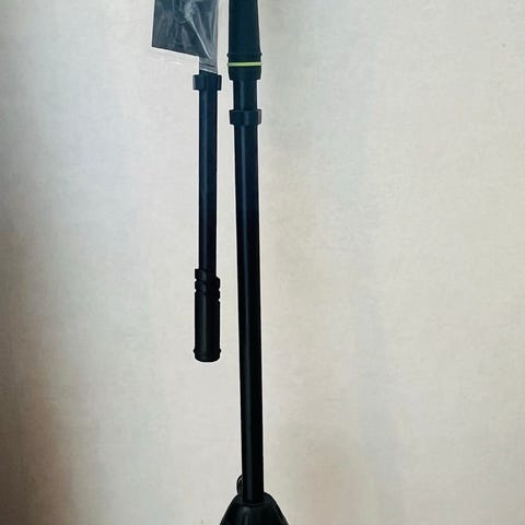 Svart mikrofonstativ med trebensstöd och justerbar höjd. Utrustat med skruvfäste upptill och låsmekanism för att justera och fixera höjden