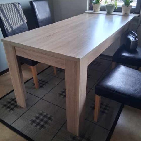 Matbord för 6-8 personer i svart utförande. Mycket bra skick förutom ett par ställen på bordskivan där färgen blivit matt.