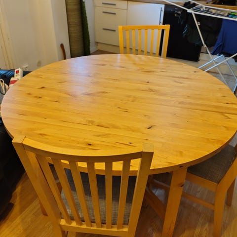 Bordet är i bra skick och passar perfekt som skrivbord, sidobord eller matbord. Kan användas separat som väggord, eller ställas ihop för att bilda ett runt bord.