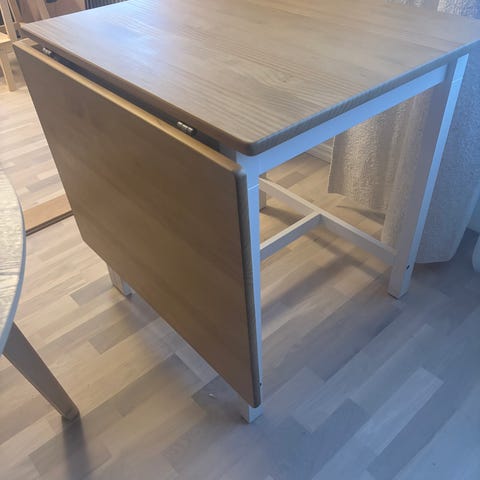 Säljer 2 praktiska halvrunda bord 60 cm vardera. Bordet är i bra skick och passar perfekt som skrivbord, sidobord eller matbord. Kan användas separat som väggord, eller ställas ihop för att bilda ett runt bord 120 cm.