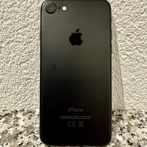 Apple iPhone 7 med 32 GB lagringsutrymme. Batterihälsan är 100 %. Olåst och felfritt. Utloggat och redo för en ny användare.